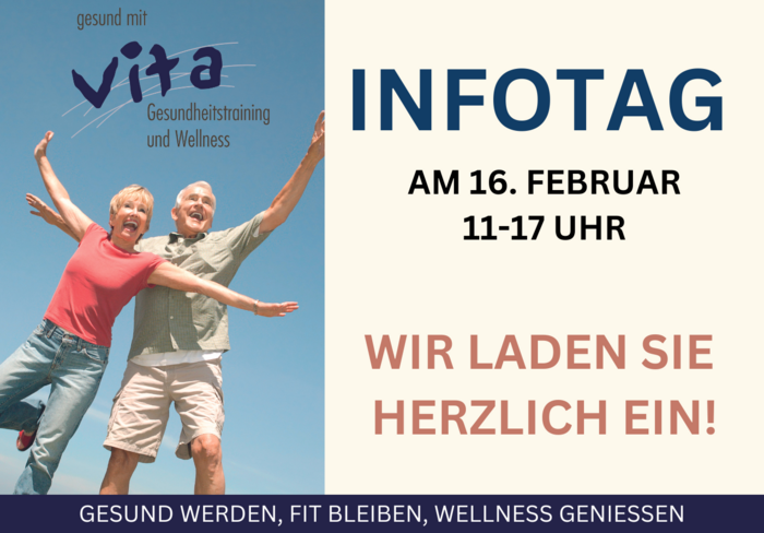 Am Sonntag, den 16. Februar 2025, lädt das Vita-Team von 11.00 bis 17.00 Uhr zum Info-Tag ein und bietet allen Interessierten die Möglichkeit, sich über das umfassende Angebot zu informieren und das Vita kennenzulernen. Wer sich an diesem Tag für eine Mitgliedschaft entscheidet, hat die Möglichkeit einen 4‑wöchigen Probevertrag (Einzel- oder Partnerverträge) abzuschließen und die Aufnahmegebühr zu sparen.
